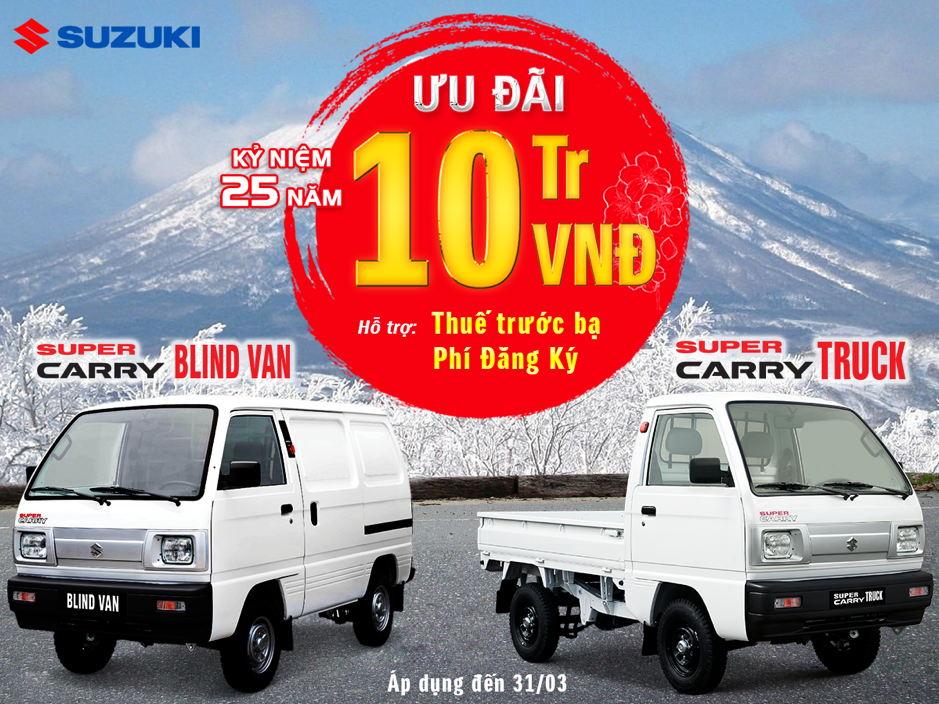 Cụ thể, dòng xe Celerio nhận hỗ trợ 15 triệu đồng, tương đương lãi suất trong 6 tháng đầu. Các dòng xe thương mại gồm Super Carry Pro, Carry Truck và Blind Van nhận hỗ trợ 10 triệu đồng, tương đương lãi suất trong 6 tháng đầu. Chương trình diễn ra trên toàn quốc, áp dụng đến hết 31/3/2020.